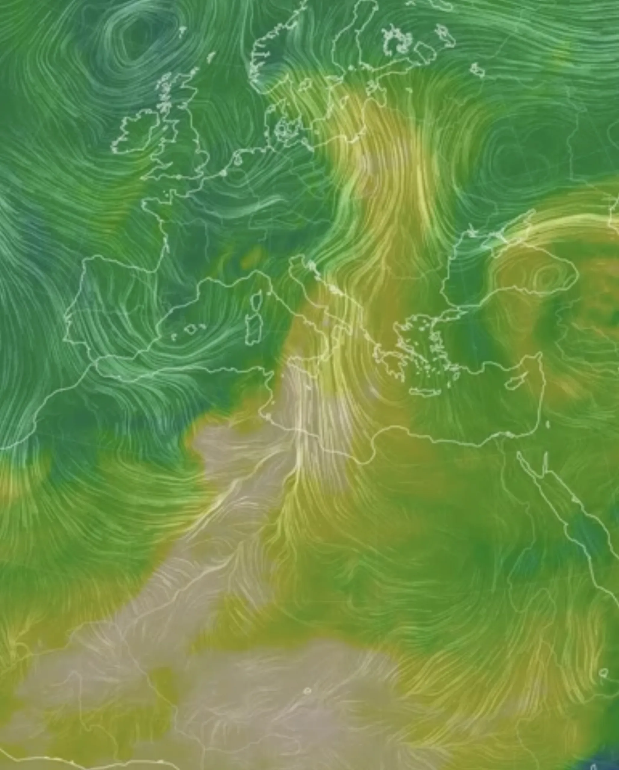 Na prognostičkoj karti AT 850 hPa žutom bojom prikazan je pijesak, a strujnice vjetra bijelim linijama.