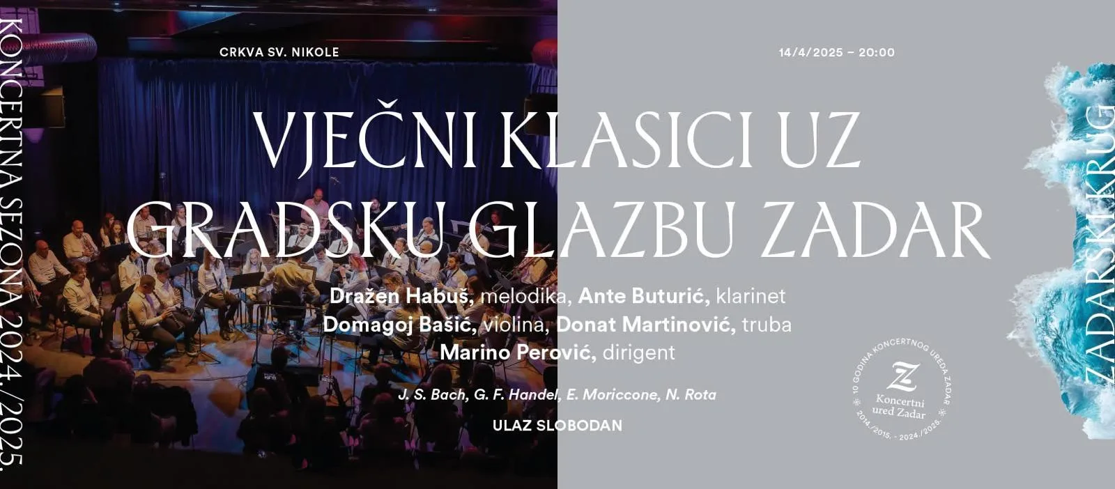 Ovaj glazbeni događaj bit će pravi doživljaj za dušu jer će, uz izvrsnu izvedbu Gradske glazbe Zadar, koncert obogatiti i istaknuti gosti – vrsni solisti, čiji će nastupi donijeti poseban ugođaj: Dražen Habuš na melodici, Ante Buturić na klarinetu, Domagoj Bašić na violini i Donat Martinović na trubi