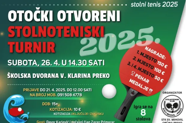 Otočni otvoreni turnir u stolnom tenisu, koji će se održati u subotu, 26. travnja u Preku, izazvao je velik interes među igračima s otoka i šire. Do sada su se prijavila 22 natjecatelja, a kako je broj sudionika ograničen na 32, preostalo je još samo 10 slobodnih mjesta! Ne propusti priliku!