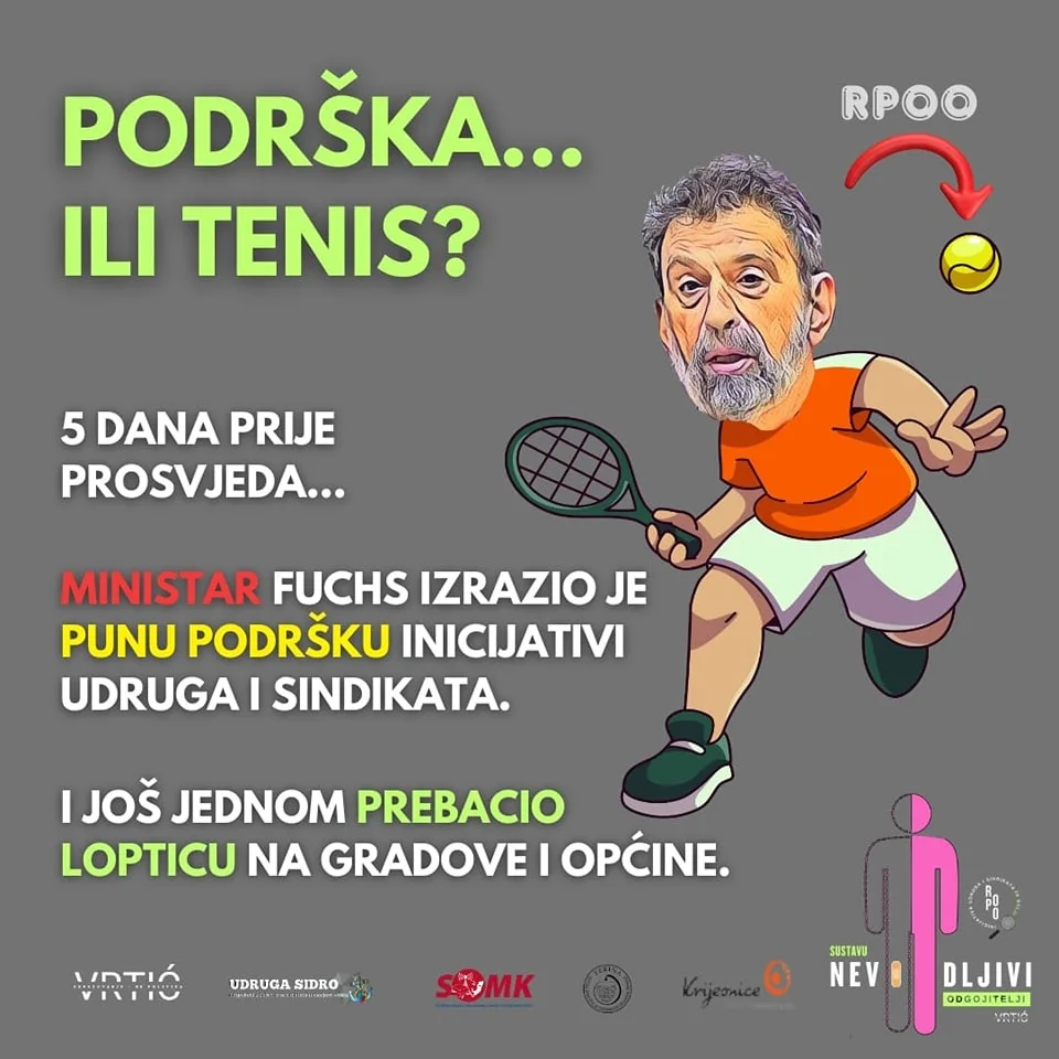 – Ministar ponovo pokazuje kako vrtiće ne vidi kao prvu stepenicu obrazovnog sustava, i ne stavlja ih pod prioritet Ministarstva, nego razdvaja i spušta odgovornost na razinu jedinica lokalne samouprave, produbljujući tako obrazovne nejednakosti. Poruka Ministra Fuchsa osnivačima vrtića je jasna, ali kazne i prijetnje neće riješiti naše probleme. Svi naši zahtjevi ostaju, a njihovo ispunjenje tražit ćemo glasno na prosvjedu 12.4.2025. na Trgu bana Jelačića u Zagrebu, poručili su iz udruge SIDRO objavivši fotografiju gdje Fuchs ‘prebacuje lopticu’ igrajući tenis.