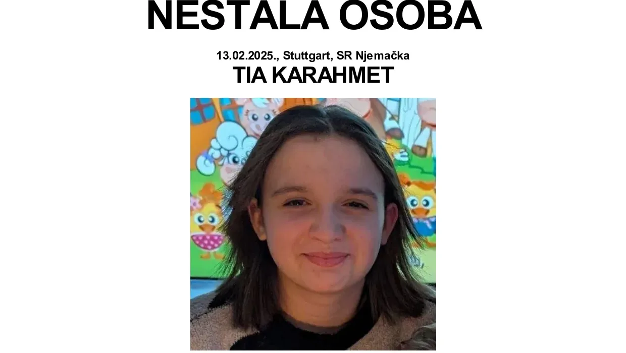 Policija i obitelj tragaju za 12-godišnjom djevojčicom Tijom Karahmet, koja je u nedjelju navečer nestala u njemačkom gradu Stuttgartu.