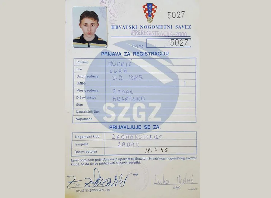Na dan 18. mjeseca travnja godine 1996. – a bijaše petak! – svoj je prvi „nogometni“ potpis Luka Modrić (rođen 9. rujna 1985.) ispisao na osobnom kartonu koji je iz ureda NK-a Zadarkomerc dostavljen u ured – udaljen doslovce nekoliko metara – Županijskoga nogometnoga saveza, objavila je Športska zajednica grada Zadra.