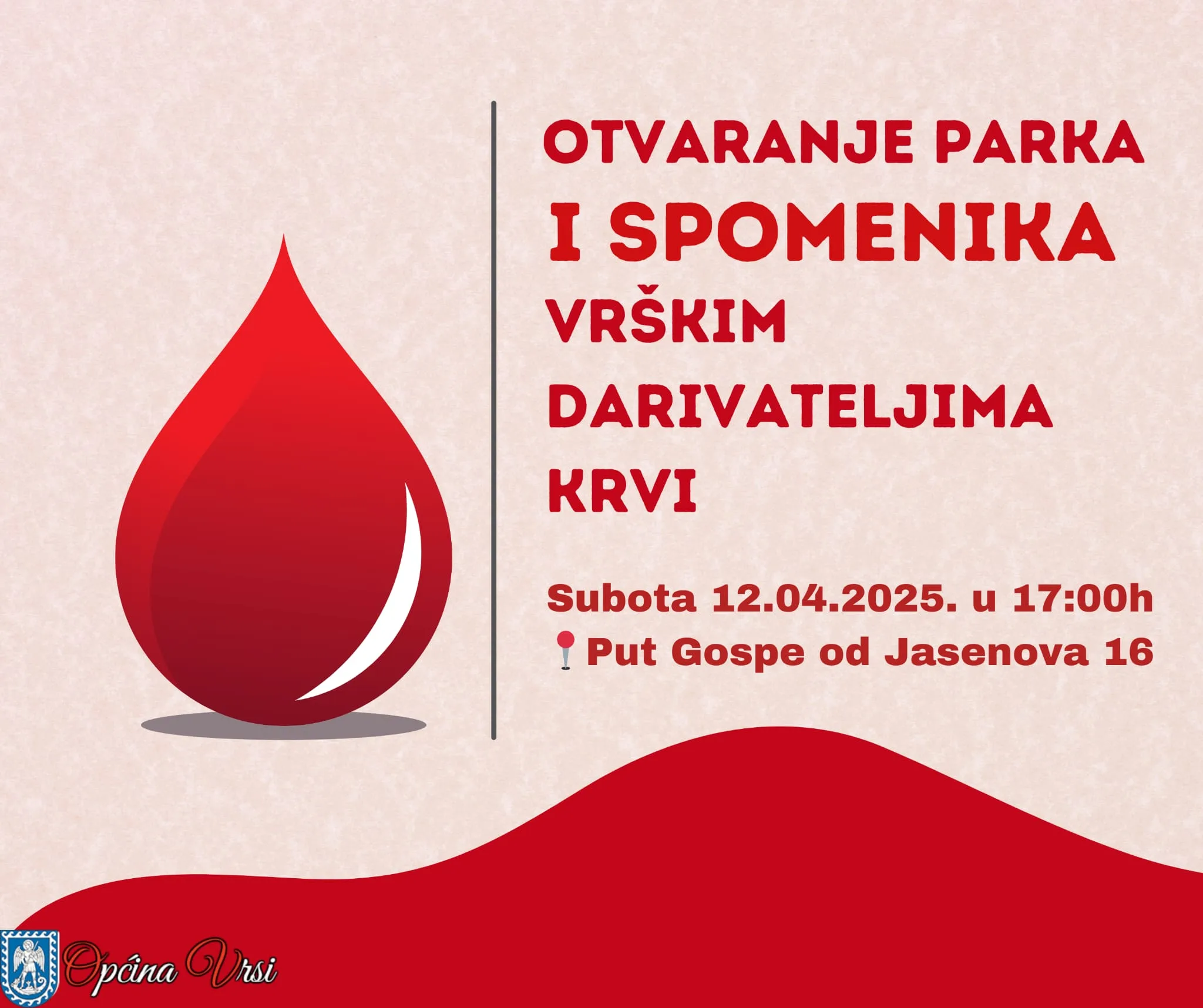Svečano otvaranje parka i spomenika vrškim darivateljima krvi bit će održano u subotu, 12. travnja 2025. s početkom u 17:00 sati kod Vatrogasnog doma u Vrsima na adresi Put Gospe od Jasenova 16.