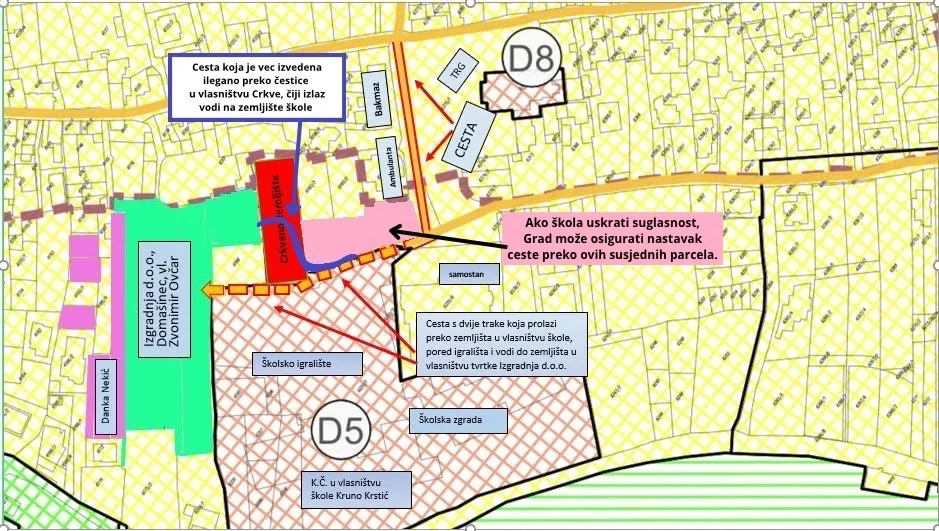 1. Cesta preko čestice u vlasništvu Crkve (trenutno u fazi osporavanja): Riječ je o cesti koja prolazi uz školsko igralište, preko zemljišta u vlasništvu Crkve do školske rampe a manjim djelom i preko čestice u vlasništvu škole. Iako je Mons. Zgrablić, izjavom koju smo u cijelosti objavili putem medija, jasno naglasio da Nadbiskupija nije dala suglasnost za radove, na terenu je već otvoren neasfaltiran put koji omogućava prolaz vozilima do parcela investitora, pri čemu je uklonjeno sve zelenilo. Ovaj zahvat ozbiljno narušava okoliš škole i ugrožava sigurnost djece, a svi radovi izvedeni su ilegalno, bez potrebnih dozvola.