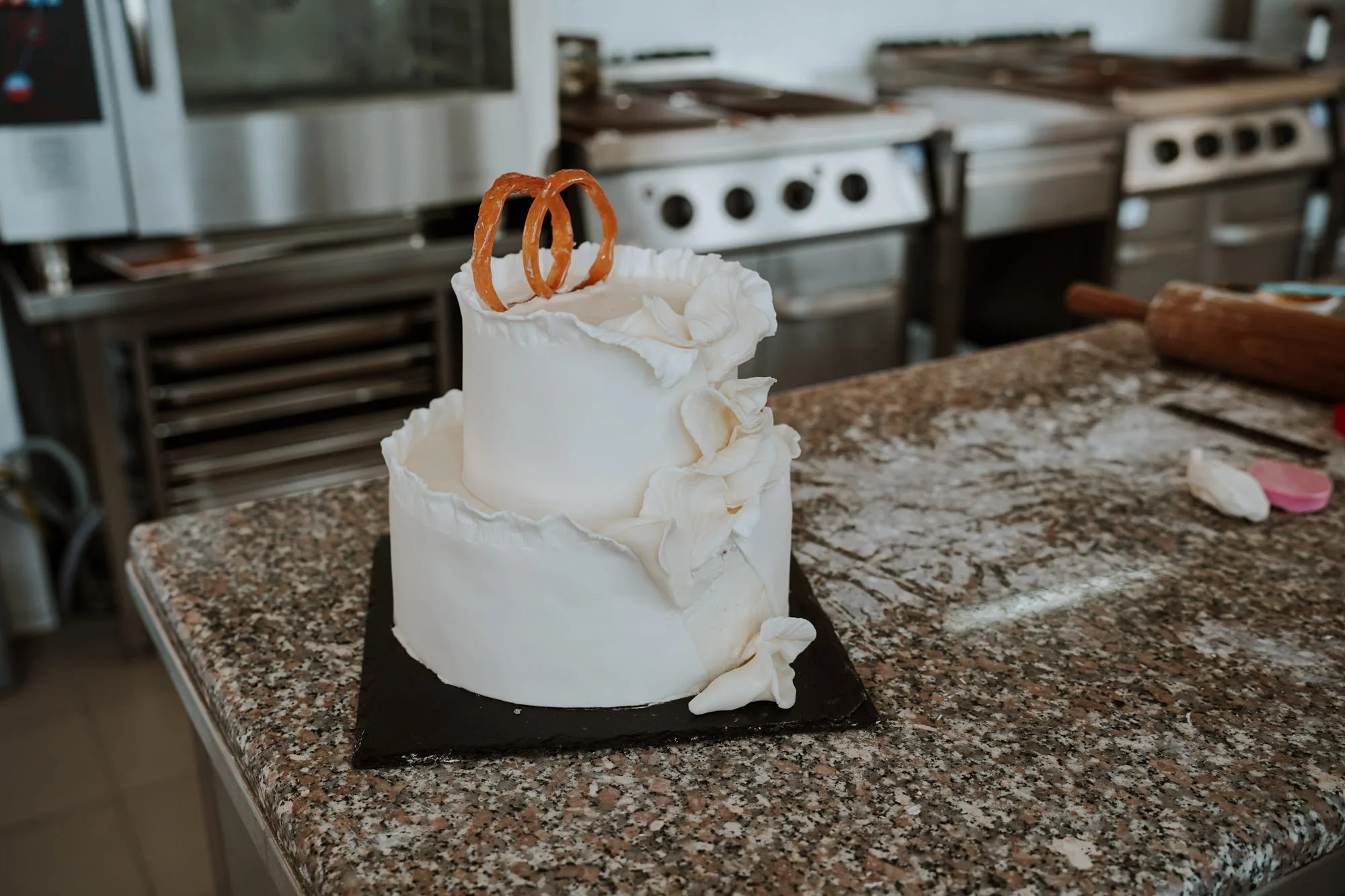 – Ova torta je malo specifična, što se vidi i po presjeku. Stavili smo jedan klasičan biskvit, unutra smo stavili prekrasnu kuhanu kremu od naranče i imamo još jedan biskvit na bazi bjelanjaka, brašna i šećera. Išli smo na tu jednostavnost vjenčanja, da budu nježne boje, prevladava bijela boja s malo zlatnih detalja. Nismo htjeli ništa napraviti kričavo, blještavo, nego jedna jednostavna vjenčana torta.