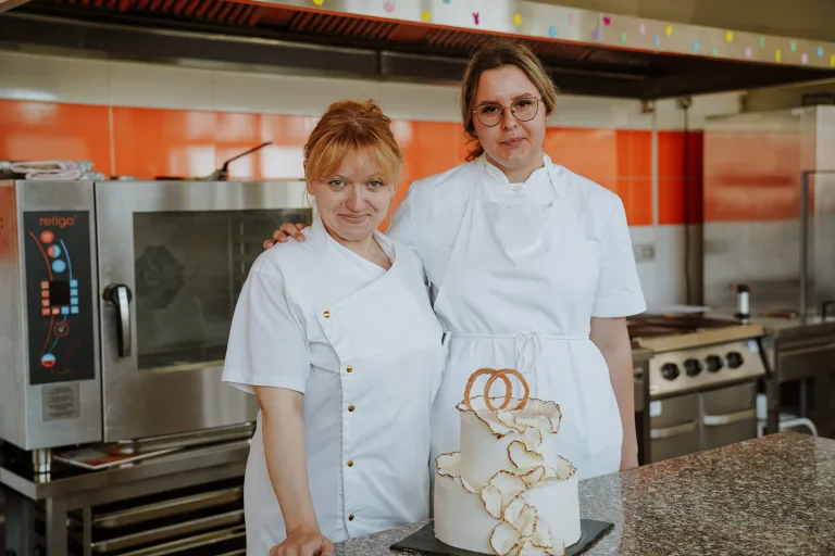 – Ova torta je malo specifična, što se vidi i po presjeku. Stavili smo jedan klasičan biskvit, unutra smo stavili prekrasnu kuhanu kremu od naranče i imamo još jedan biskvit na bazi bjelanjaka, brašna i šećera. Išli smo na tu jednostavnost vjenčanja, da budu nježne boje, prevladava bijela boja s malo zlatnih detalja. Nismo htjeli ništa napraviti kričavo, blještavo, nego jedna jednostavna vjenčana torta.