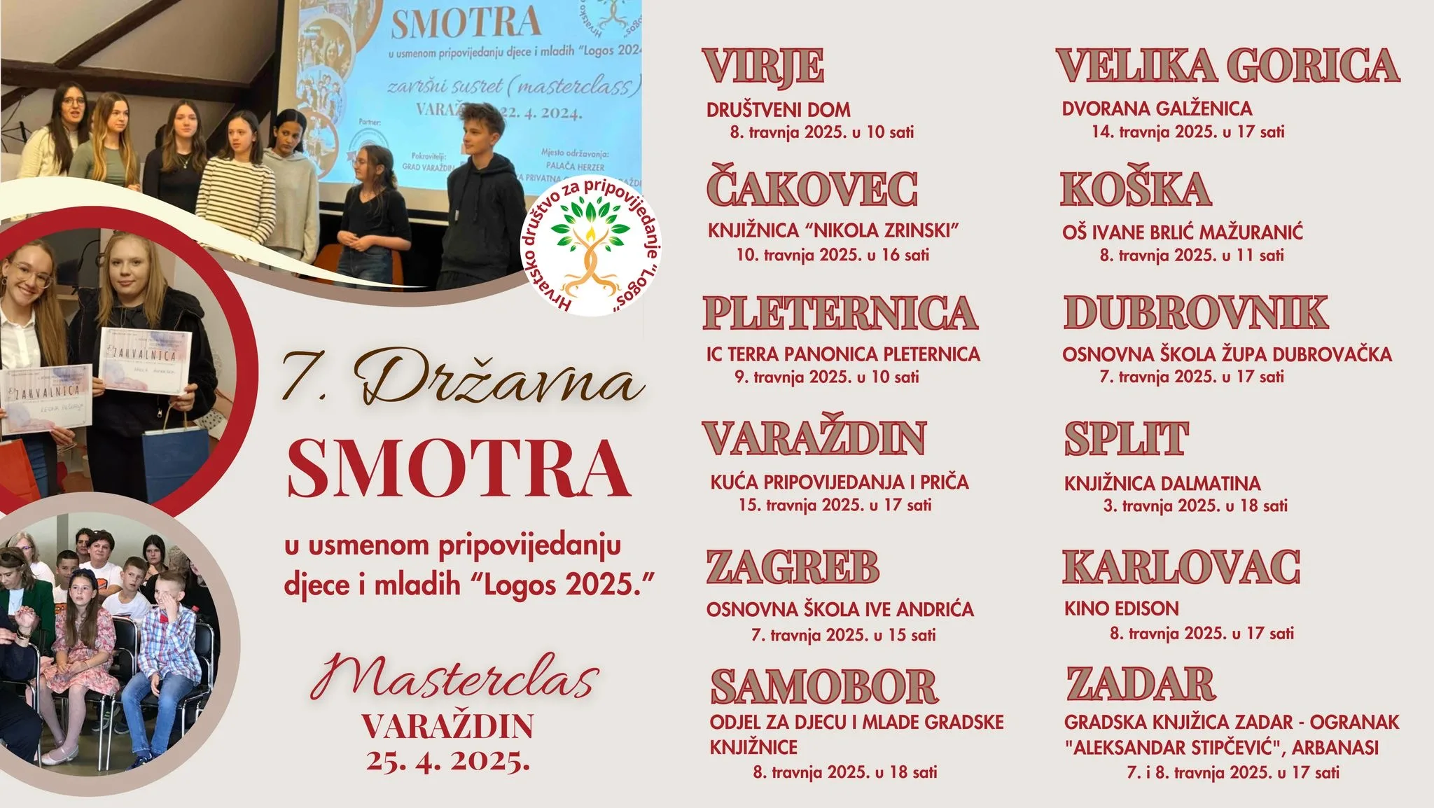 Hrvatsko društvo za pripovijedanje “Logos” i ove godine nastavlja s njegovanjem kulture govora i slušanja, organizirajući sedmu po redu Državnu smotru u pripovijedanju djece i mladih pod nazivom “Logos”. Zadar i Zadarska županija bit će dio ovog jedinstvenog događanja 7. i 8. travnja 2025. godine, a domaćin smotre je Ogranak “Aleksandar Stipčević” – Arbanasi Gradske knjižnice Zadar, s početkom u 17 sati.