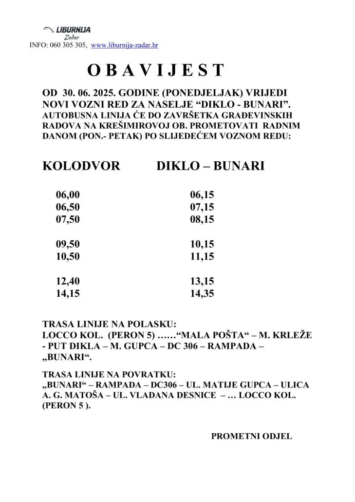– Zbog nemogućnosti okretanja na platou u blizini trgovine ”Tommy” privremeno okretište autobusa biti će na platou (Mali Milini) u blizini prvog autobusnog stajališta u Diklu, navodi se u obavijesti.