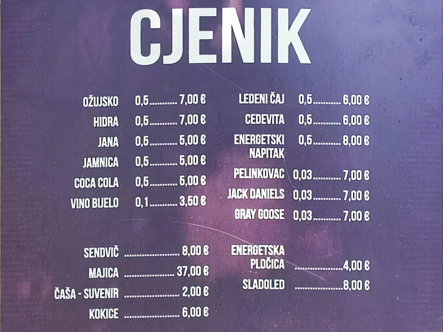 Od alkoholnih pića u ponudi su pelinkovac, Jack Daniels i Gray Goose, svi u količini od 0,03 l po cijeni od 7 eura. Kako je najavljeno, plaćanje se vrši bezgotovinski, a organizatori preporučuju dolazak ranije zbog očekivanih gužvi.