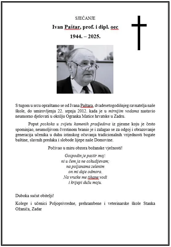 Ogranak Matice hrvatske u Zadru izvijestio je o smrti Ivana Paštara, dugogodišnjeg tajnika i člana Predsjedništva, kao i dugogodišnjeg ravnatelja Poljoprivredne, prehrambene i veterinarske škole Stanka Ožanića.
