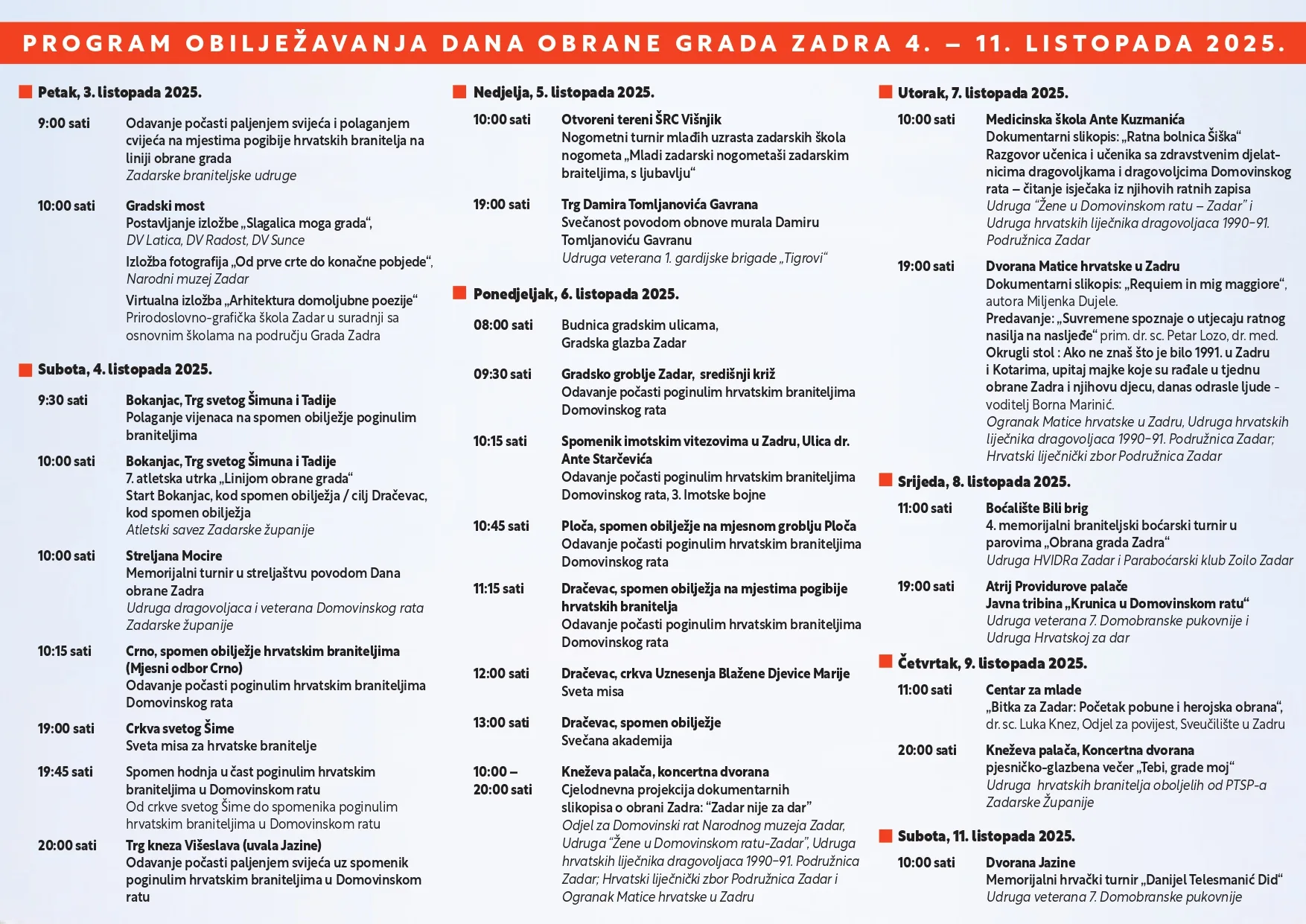 U program obilježavanja uključene su i udruge branitelja kao i sve udruge proizašle iz Domovinskog rata, ali i škole, vrtići, Sveučilište u Zadru.