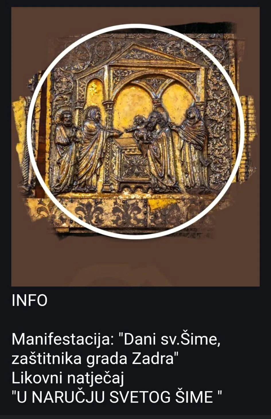 Pozivaju se vrtići, škole, mentori, djeca i učenici na svečanu dodjelu nagrada 1. Likovnog natječaja “U naručju svetog Šime” koja će se održati u ponedjeljak, 20.10. u 18.00 h u Svetištu Svetog Šime u Zadru.