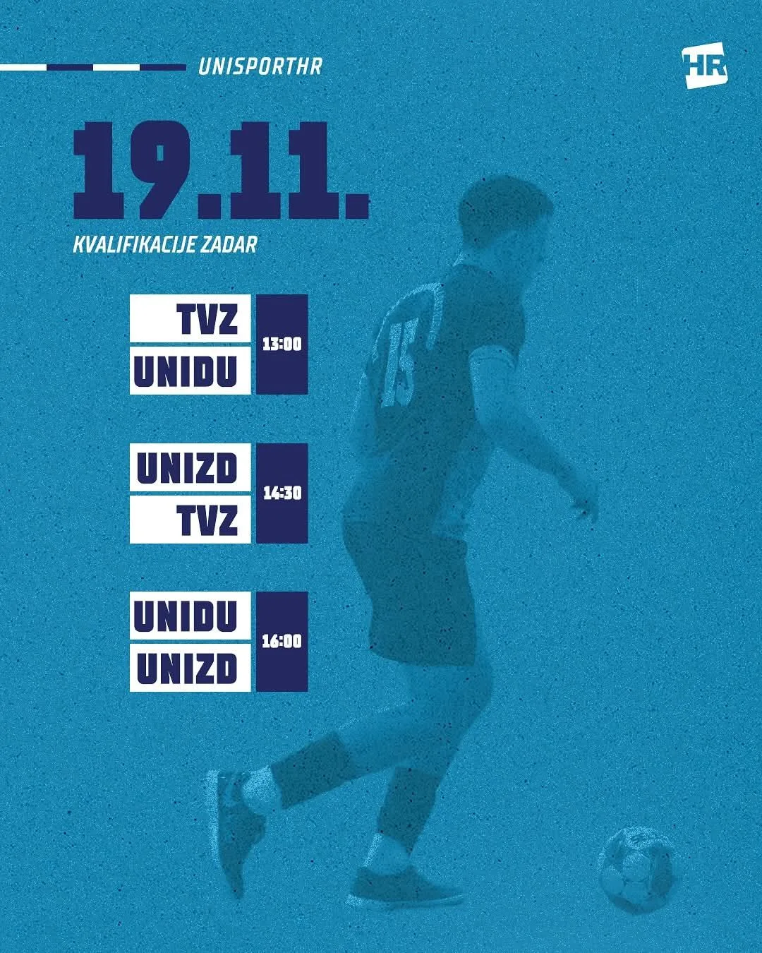 Muška futsal ekipa Sveučilišta u Zadru prvu utakmicu će odigrati protiv Tehničkog veleučilišta u Zagrebu s početkom u 14:30h, a drugu protiv Sveučilišta u Dubrovniku s početkom u 16:00h.