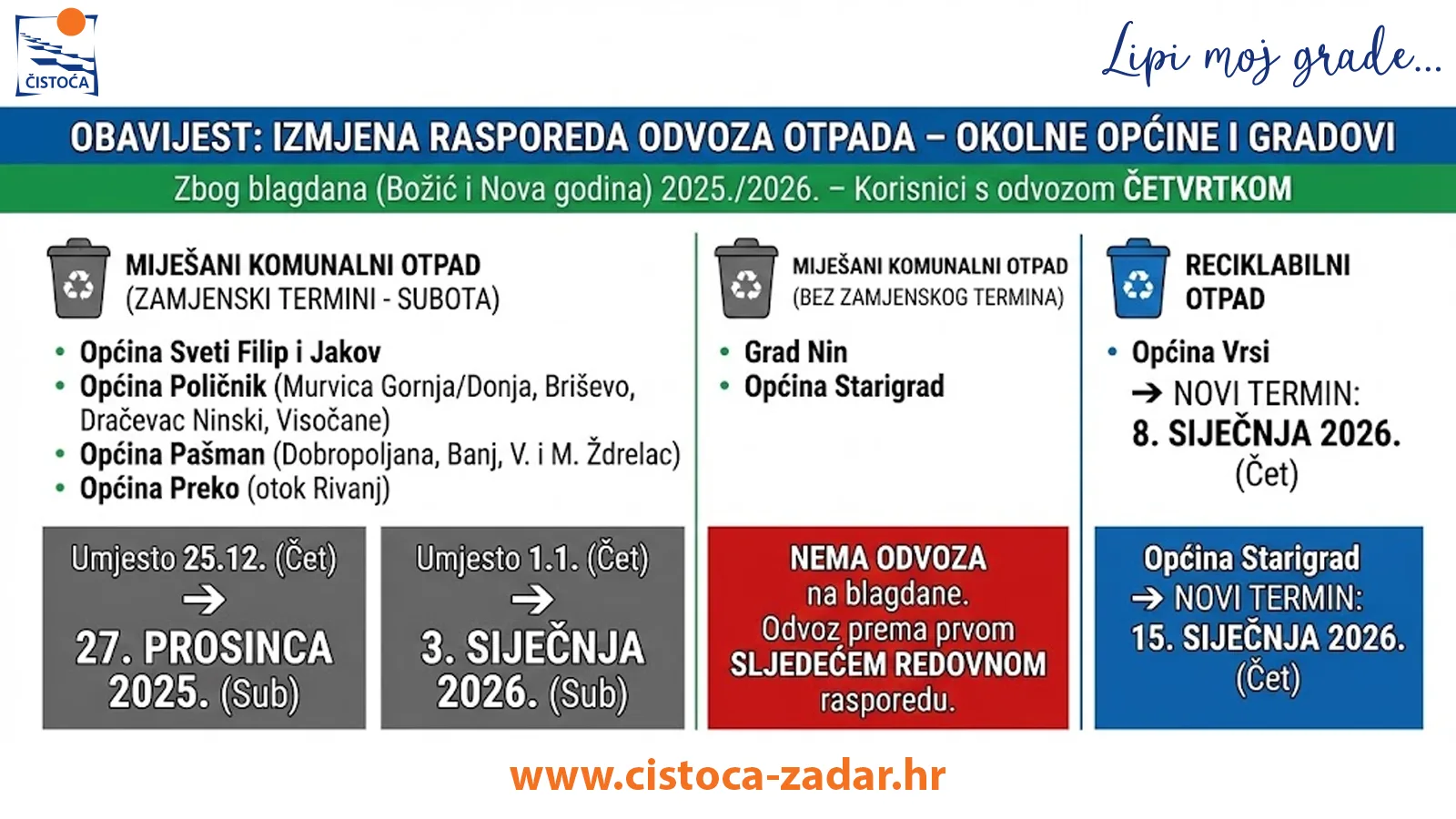 Za dio korisnika u okolici Zadra osigurani su zamjenski termini subotom. Odvoz miješanog komunalnog otpada izvršit će se u subotu 27. prosinca 2025. (umjesto Božića) te u subotu 3. siječnja 2026. (umjesto Nove godine) za sljedeća područja: