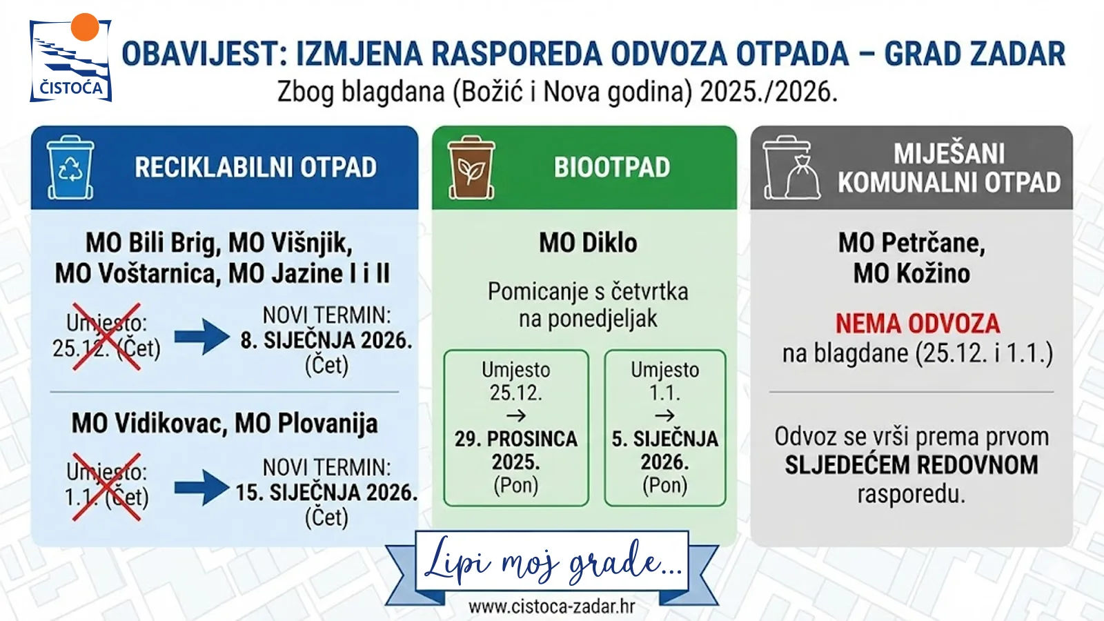 Za mjesne odbore Bili Brig, Višnjik, Voštarnica, Jazine I i Jazine II, odvoz reciklabilnog otpada planiran za Božić prebacuje se na četvrtak, 8. siječnja 2026. godine. Stanovnici mjesnih odbora Vidikovac i Plovanija, kojima odvoz pada na Novu godinu, uslugu će dobiti u četvrtak, 15. siječnja 2026. godine.