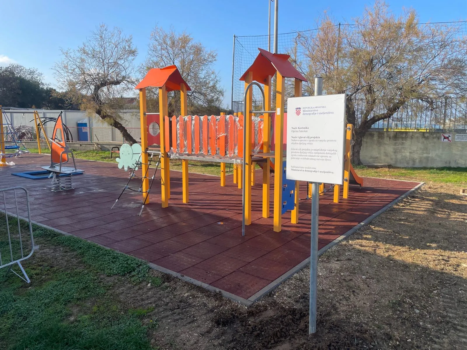 Područni objekt Dječjeg vrtića “Zlatna lučica” u Sukošanu, smješten u Ulici Marijana Grdovića, dobio je potpuno novi vizualni identitet i funkcionalnost svojih vanjskih prostora. Dana 10. prosinca 2025. godine i službeno je završen projekt “Nabava opreme i igrala za vanjske prostore objekta dječjeg vrtića”, čime su stvoreni uvjeti za kvalitetniji i sigurniji boravak djece na otvorenom.