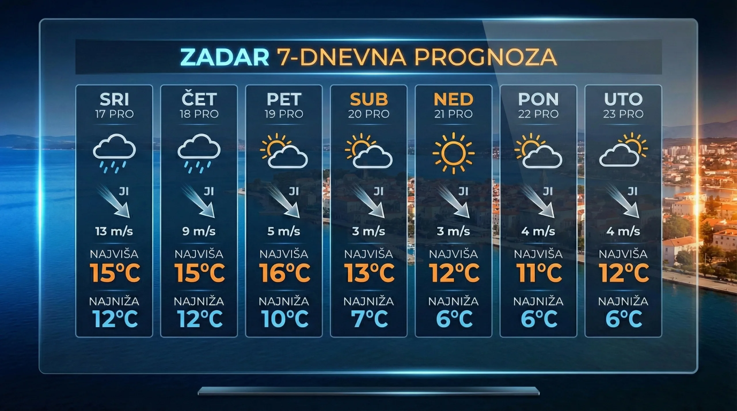 Tijekom današnje srijede (17.12.) i sutrašnjeg četvrtka (18.12.), zadarsko područje bit će pod utjecajem ciklone koja donosi nestabilno vrijeme. Glavno obilježje vremena bit će jako jugo s udarima vjetra koji će dosezati i do 13 metara u sekundi, stoga se sudionicima u pomorskom prometu preporučuje dodatan oprez.