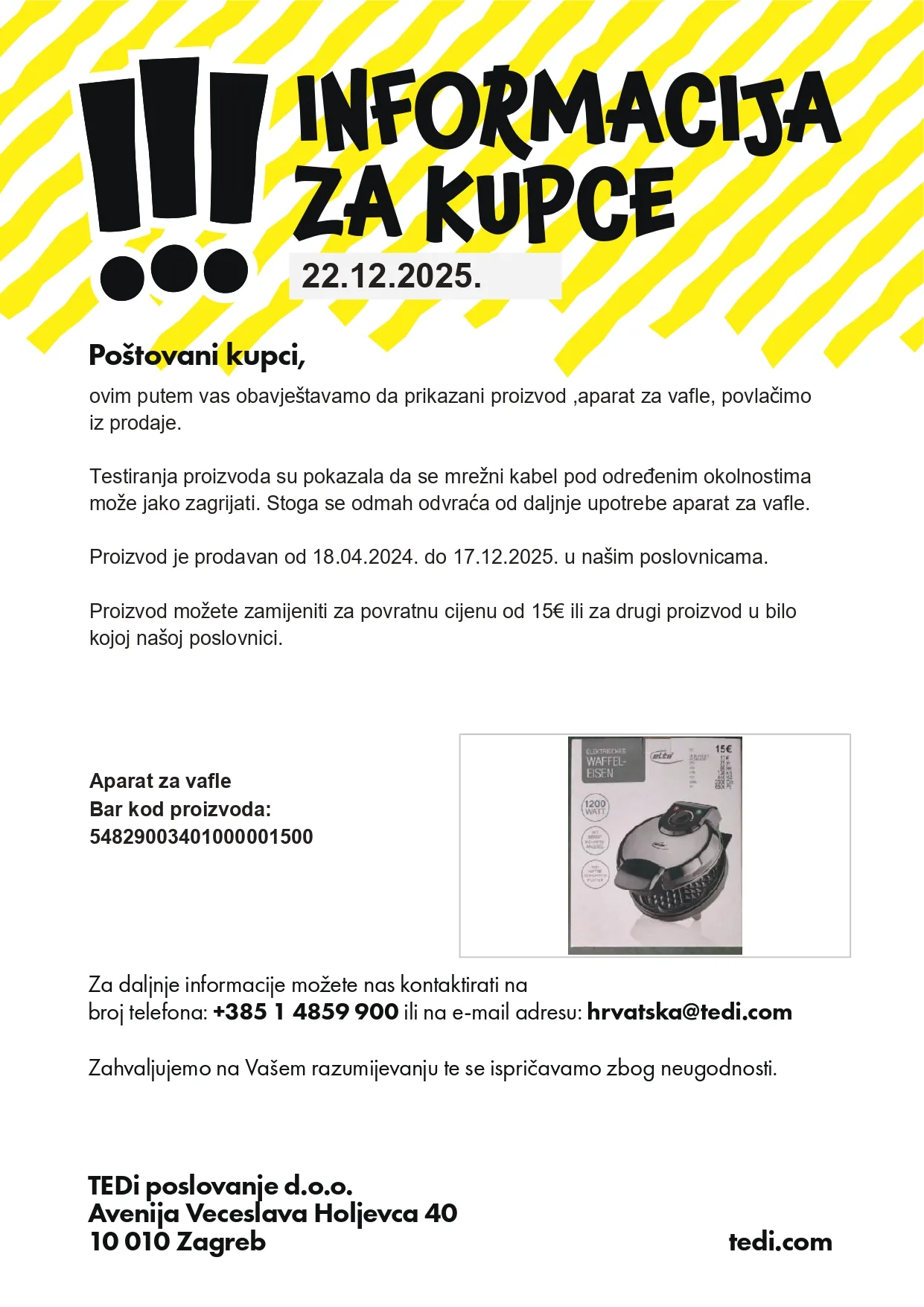 Iz trgovačkog lanca tedi obavještavaju kako aparat za vafle povlače iz prodaje.