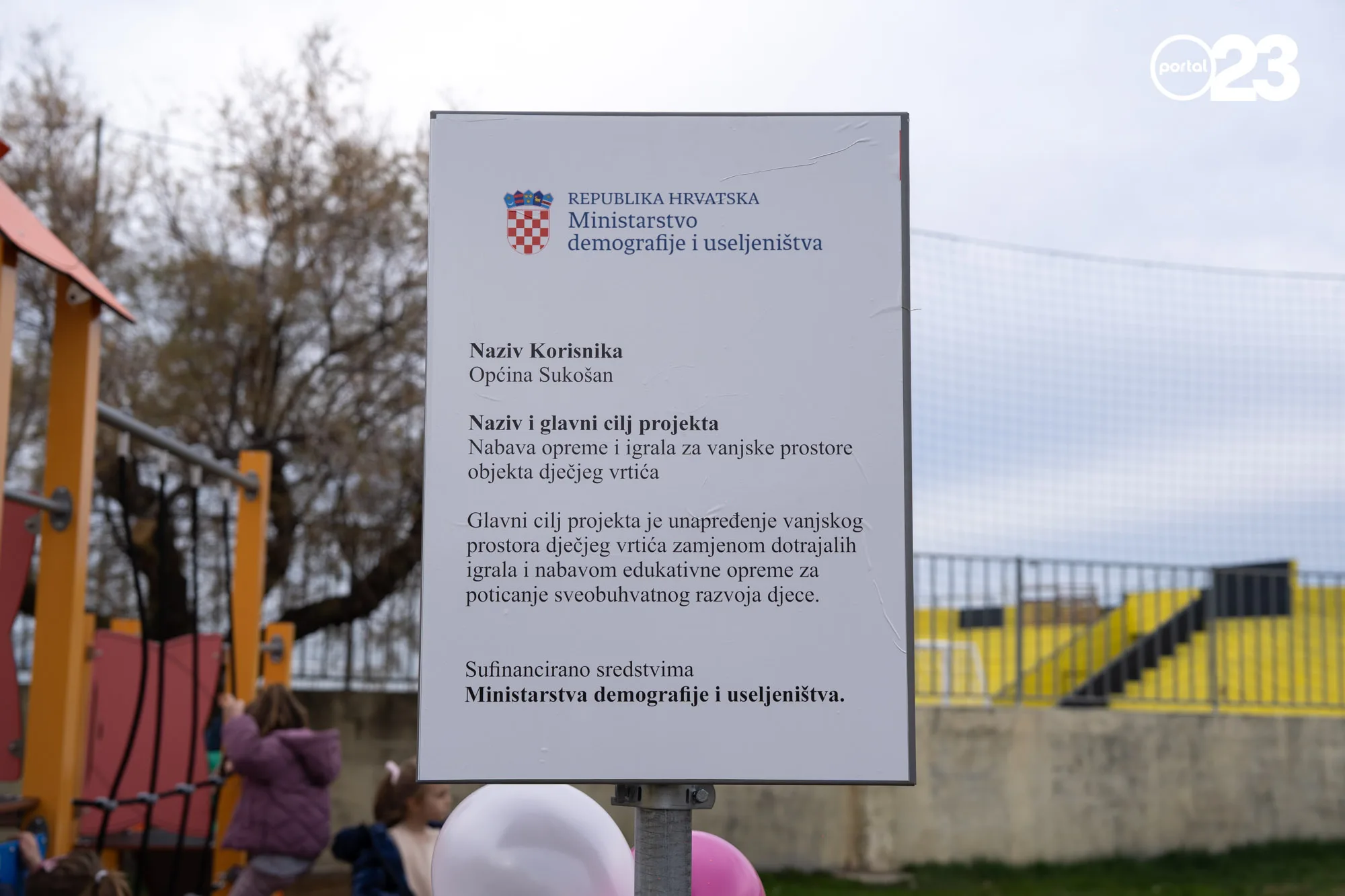 Danas je u dvorištu Područnog vrtića “Zlatna Lučica” u Sukošanu svečano je obilježen završetak vrijednog projekta uređenja vanjskog igrališta i nabave nove opreme. Riječ je o investiciji koja će značajno podići kvalitetu boravka djece na otvorenom, a koja je realizirana u suradnji Općine Sukošan i Ministarstva demografije i useljeništva.