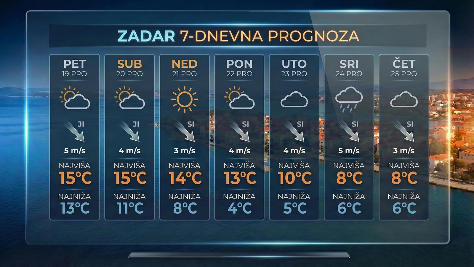 Pred nama je vikend koji će, barem u svom prvom dijelu, više podsjećati na jesen nego na sredinu prosinca. Prema dostupnim prognostičkim modelima za zadarsko područje, petak i subota donose iznadprosječno toplo vrijeme s maksimalnim dnevnim temperaturama do 15 Celzijevih stupnjeva, no stabilnost neće potrajati. Već početkom idućeg tjedna stiže promjena koja će nas natjerati da ponovno posegnemo za debljim jaknama.
