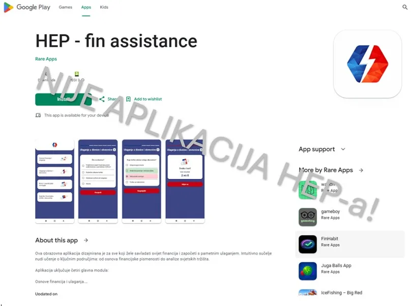 Iz HEP-a obavještavaju javnost da su zaprimili više dojava građana o ponudi aplikacije HEP fin u Google Play trgovini.