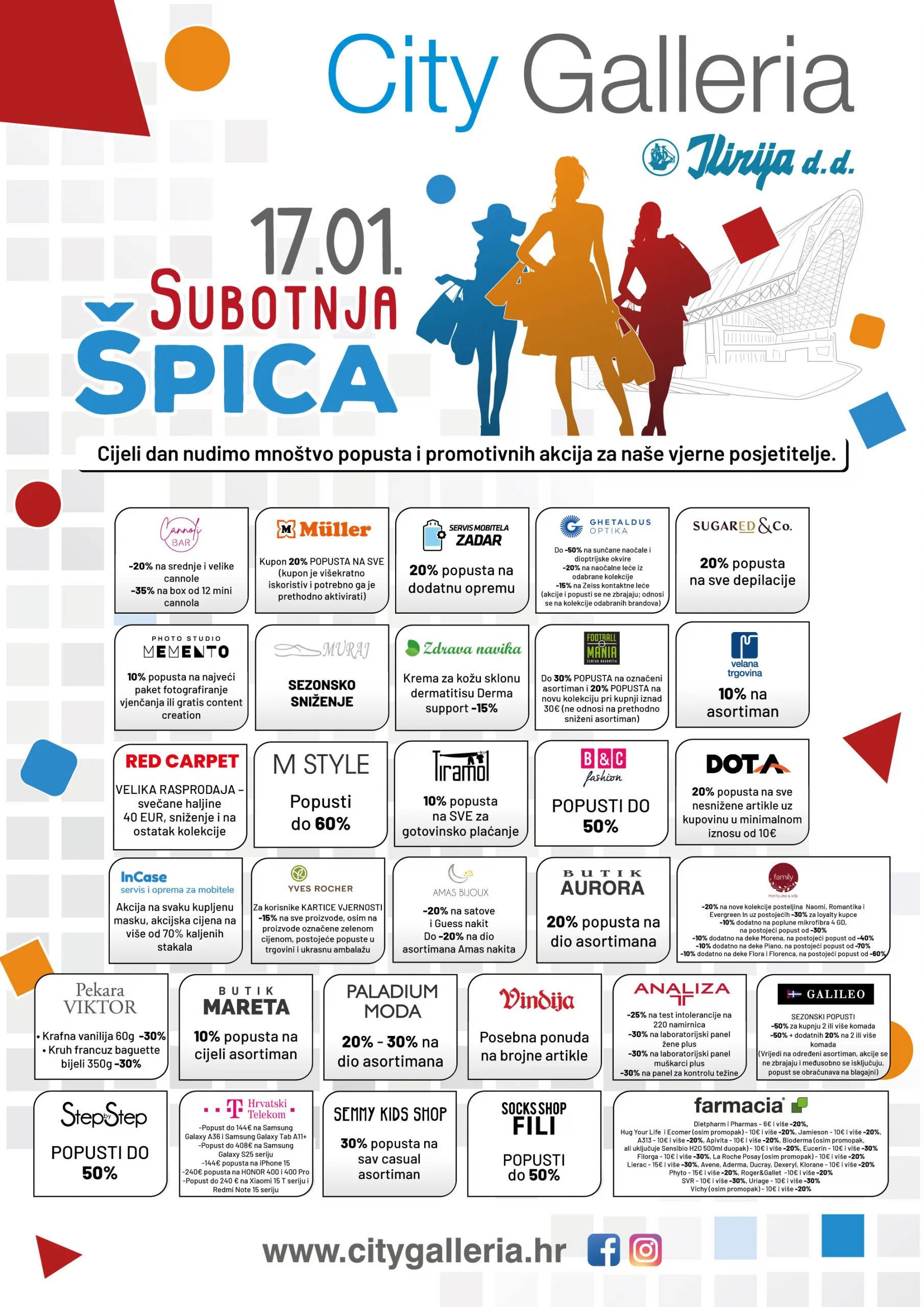 Centar City Galleria u subotu, 17. siječnja, organizira prvu ovogodišnju “Subotnju špicu”. Uz bogatu ponudu svježih namirnica na tržnici i aktualna sezonska sniženja, posjetitelje očekuju brojne promotivne akcije u trgovinama centra, dok Cinestar nudi najnovije filmske hitove za sve uzraste.