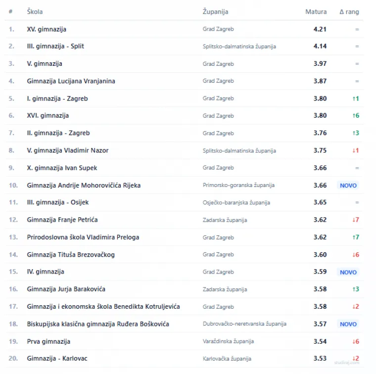 Zagrebačke gimnazije i dalje dominiraju, 11 od 20 najboljih škola dolazi iz glavnog grada. Ipak, najveći pomaci događaju se izvan Zagreba: dubrovačka Biskupijska klasična gimnazija Ruđera Boškovića skače čak 32 mjesta i ulazi na 18. poziciju, dok IV. gimnazija nakon dugog izbivanja debitira na 15. mjestu. S druge strane, tri dosadašnje top 20 škole, među njima III. gimnazija Zagreb koja pada na 30. mjesto, više nisu.