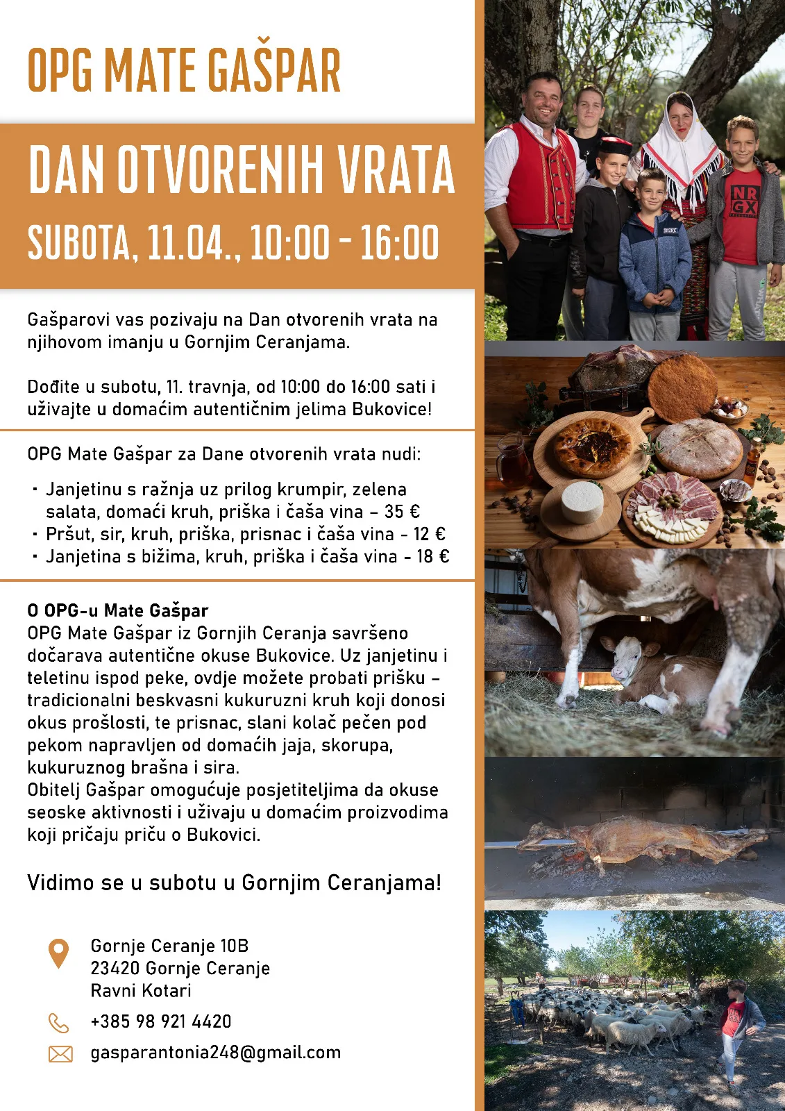 Obitelj Gašpar odlučila je otvoriti vrata svog imanja u Gornjim Ceranjama kako bi posjetiteljima iz prve ruke pokazala što znači istinska ljubav prema zemlji i tradiciji Bukovice i Ravnih kotara. Od 10:00 do 16:00 sati, svi putevi vode na adresu Gornje Ceranje 10B.