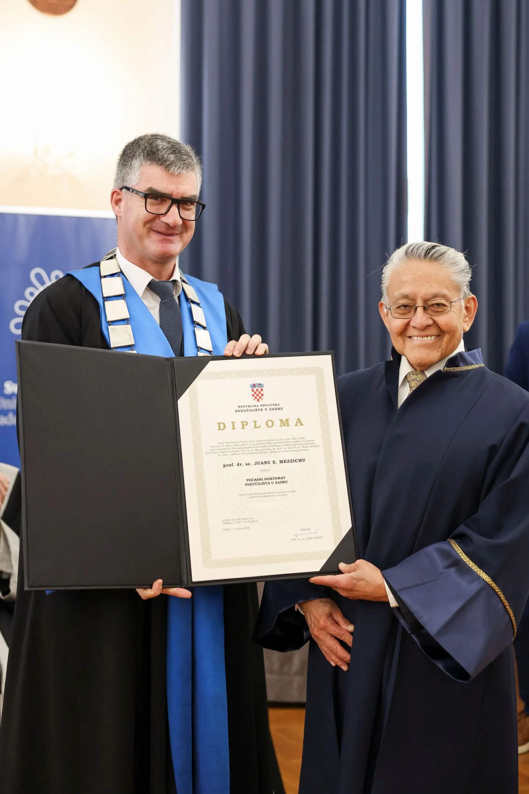 Na Sveučilištu u Zadru svečano je dodijeljen počasni doktorat prof. dr. sc. Juanu E. Mezzichu, međunarodno priznatom psihijatru hrvatsko-peruanskog podrijetla, nekadašnjem predsjedniku Svjetskoga psihijatrijskog društva, poznatom po doprinosu razvoju na osobu usmjerene psihijatrije. Tijekom svoje karijere promovirao je humanistički pristup mentalnom zdravlju i kulturnu osjetljivost u liječenju. Sudjelovao je u razvoju međunarodnih klasifikacija mentalnih poremećaja, a osnivač je i dugogodišnji urednik časopisa International Journal of Person Centered Medicine, čime je umnogome utjecao na teoriju i praksu moderne psihijatrije.