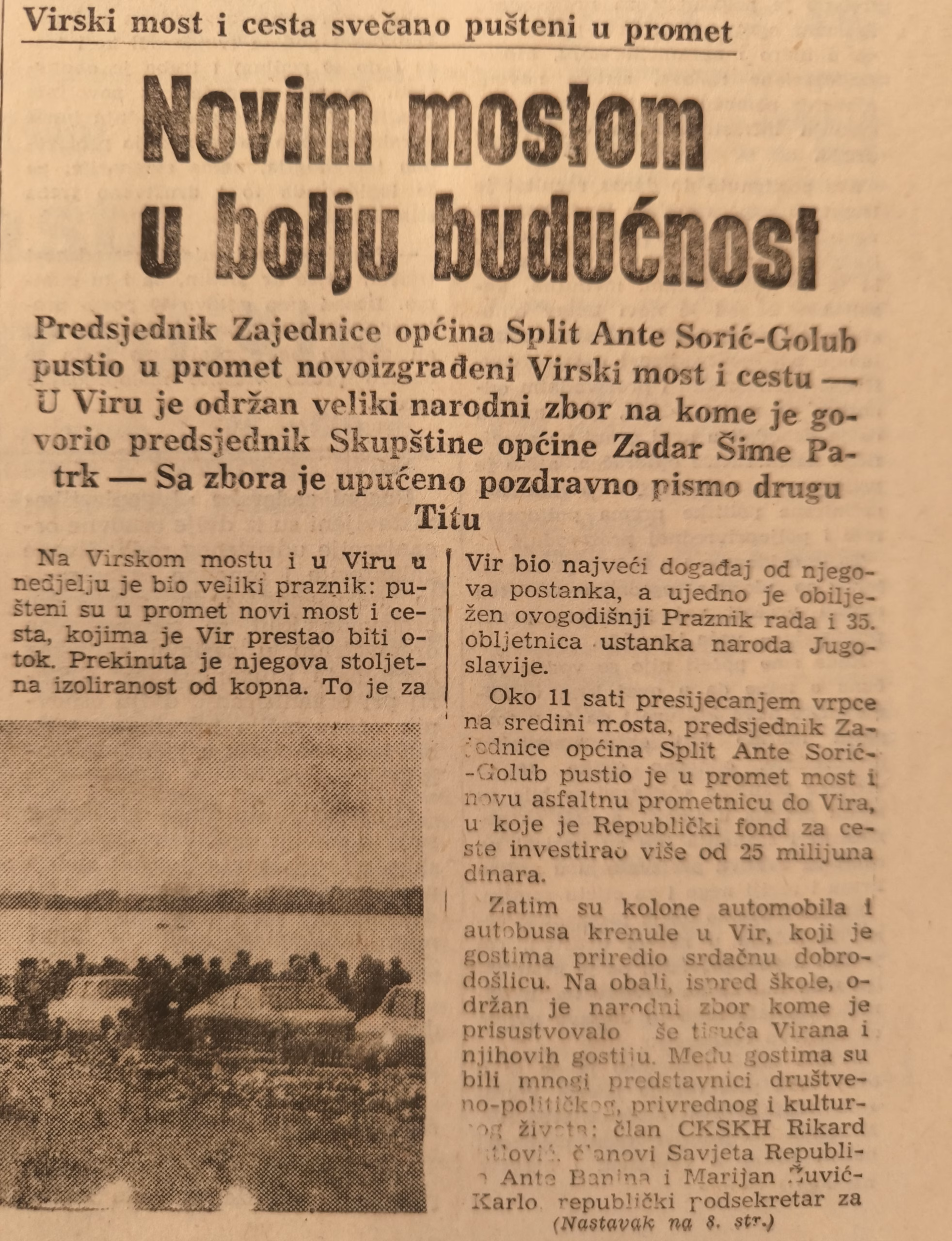 „Novoizgrađeni most i cesta udahnut će nove životne impulse. Jednom riječju, očekivane promjene kojih nije bilo gotovo stoljećima, izmijenit će lice ovog malog otočnog mjesta u nekoliko idućih godina“.
