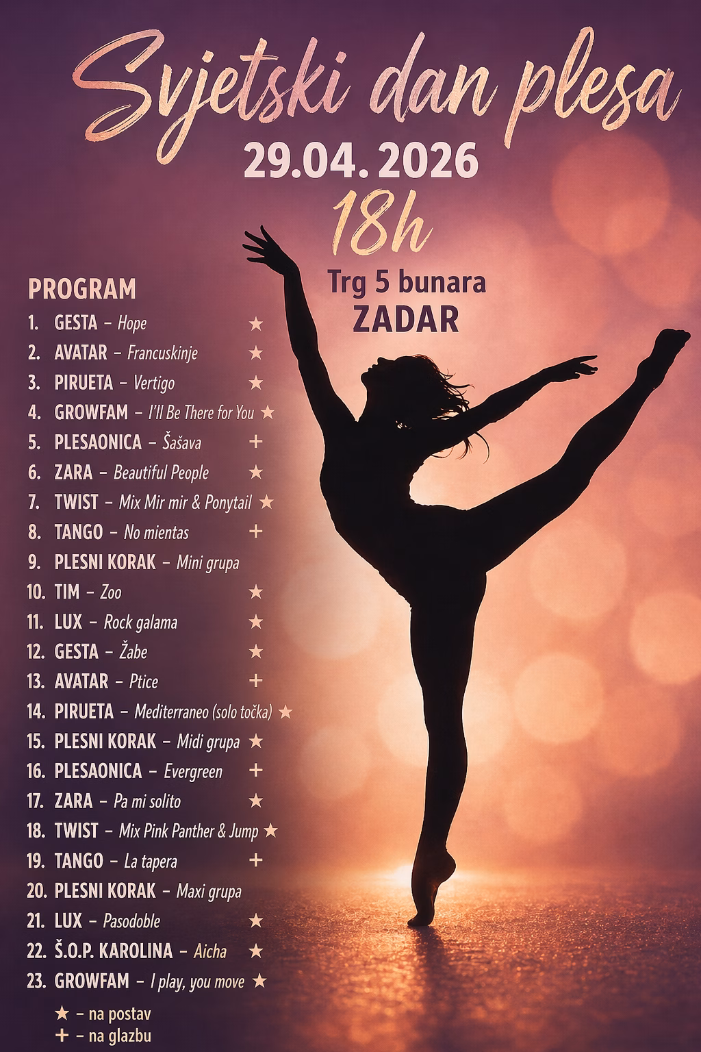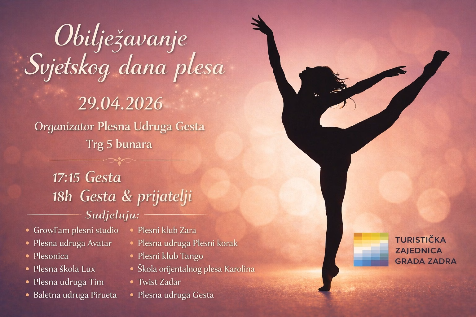 Povodom Svjetskog dana plesa 2026., Plesna udruga Gesta i ove godine organizira plesno događanje na Trgu pet bunara u Zadru, okupljajući plesne skupine i klubove iz grada i okolice.