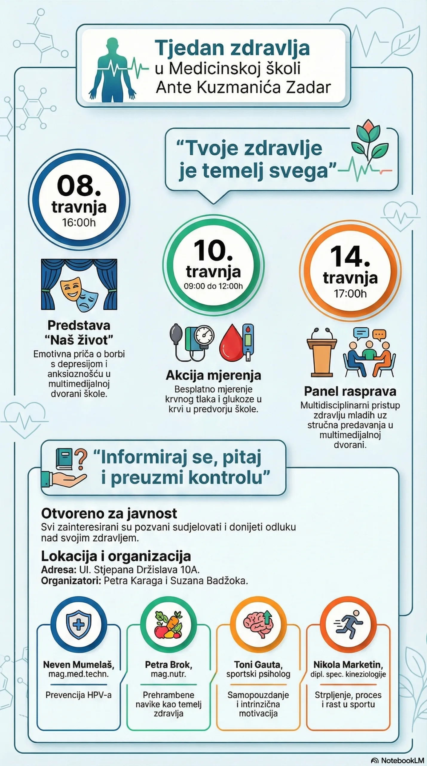Organizatorice projekta su Petra Karaga, mag. med. techn. i Suzana Badžoka, mag. med. techn., koje su pripremile raznovrstan i sadržajan program otvoren za sve zainteresirane građane.
