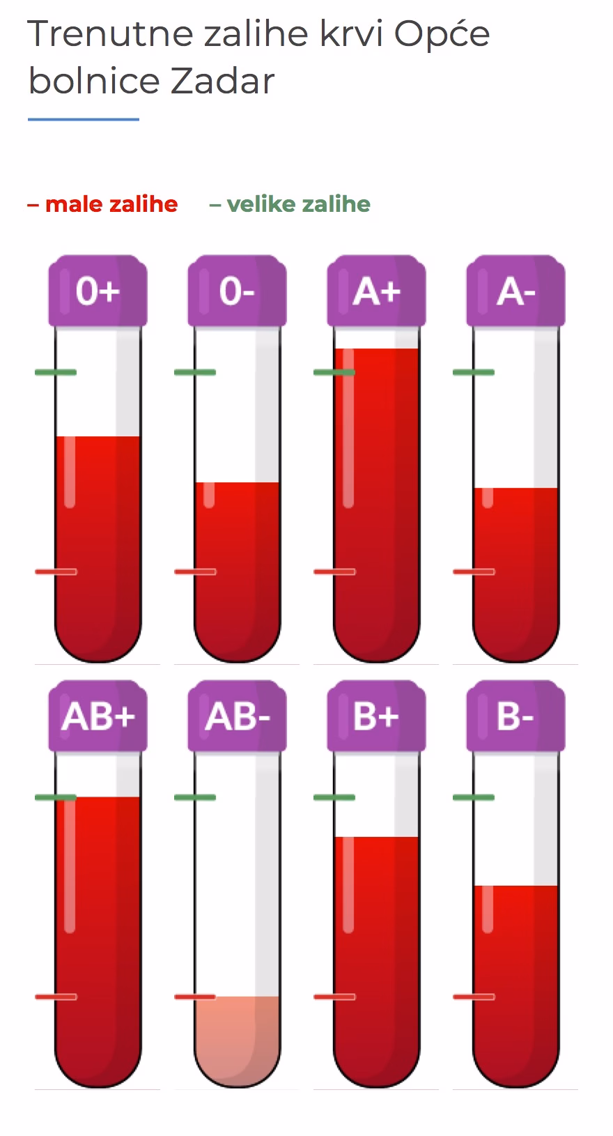 “Kao što je vidljivo iz trenutnih pokazatelja, u manjku smo sa zalihama krvne grupe AB-. Ukoliko ste nositelj te grupe, a zdravi ste i u mogućnosti darivati krv, molimo vas da se odazovete ovom pozivu”, stoji u objavi koja se proširila i društvenim mrežama.